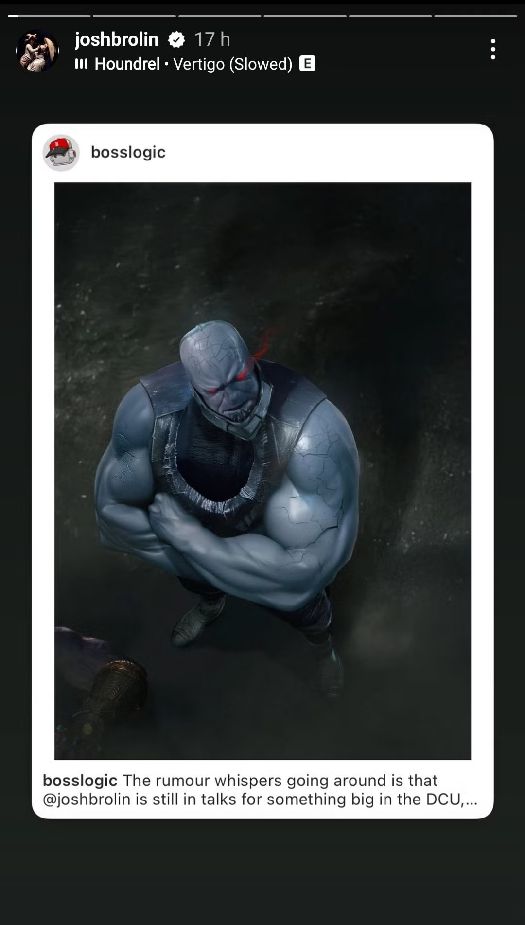 Josh Brolin may take on the role of Darkseid in the DC Universe, but no official confirmation exists as of now. While he has shown interest by resharing fan art of himself as Darkseid in an Instagram Story, it remains speculative as to whether he will portray the iconic DC villain.